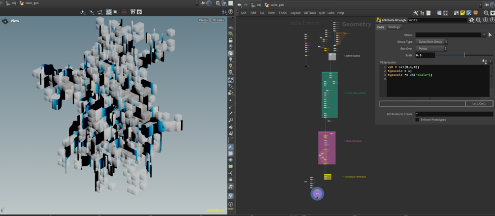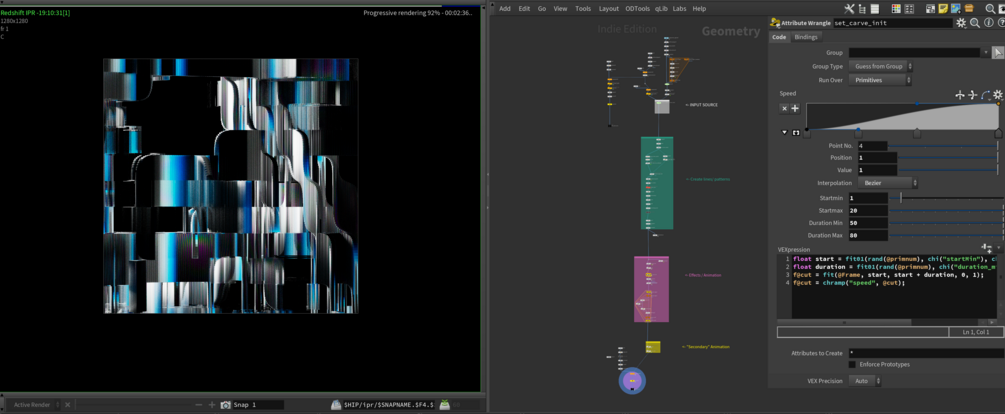 The setup starts by using findShortestPath to generate the base curve shape. I then apply a fractional value along the curve’s u attribute, multiplied by time, to animate color offsets along each line. To enhance the motion, I offset the orientation on each point and set the curves to grow as they’re activated.